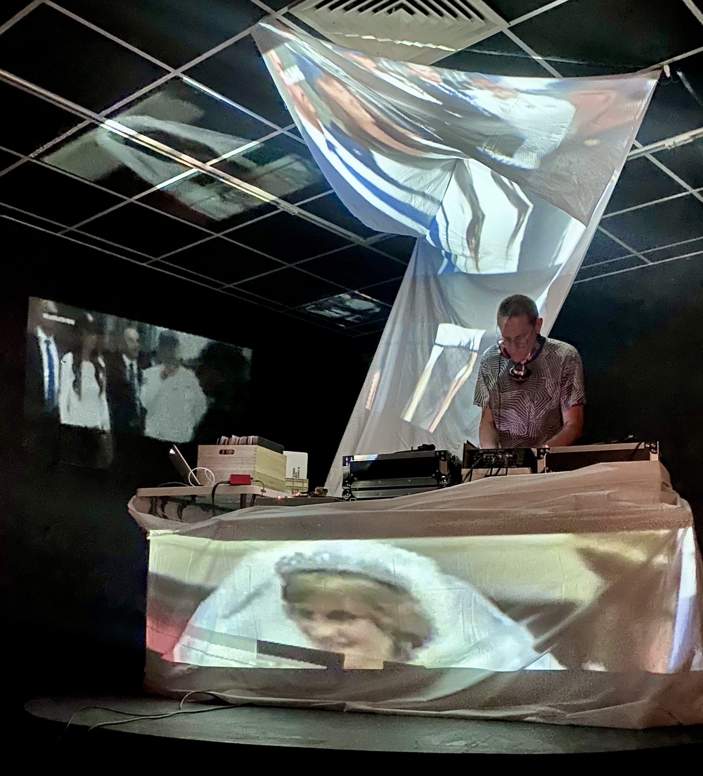 FACET is an immersive experience guided by daniel johnson blending music and video across three turntables and projections mapping surfaces across the venue. Broadcast footage cascades across site specific fabric installation, concealed and revealed while johnson shapes the space with a collage of sound on three turntables. This improvisation with prepared clips and vinyl grapples with our shared public memory of world events as seen on tv.