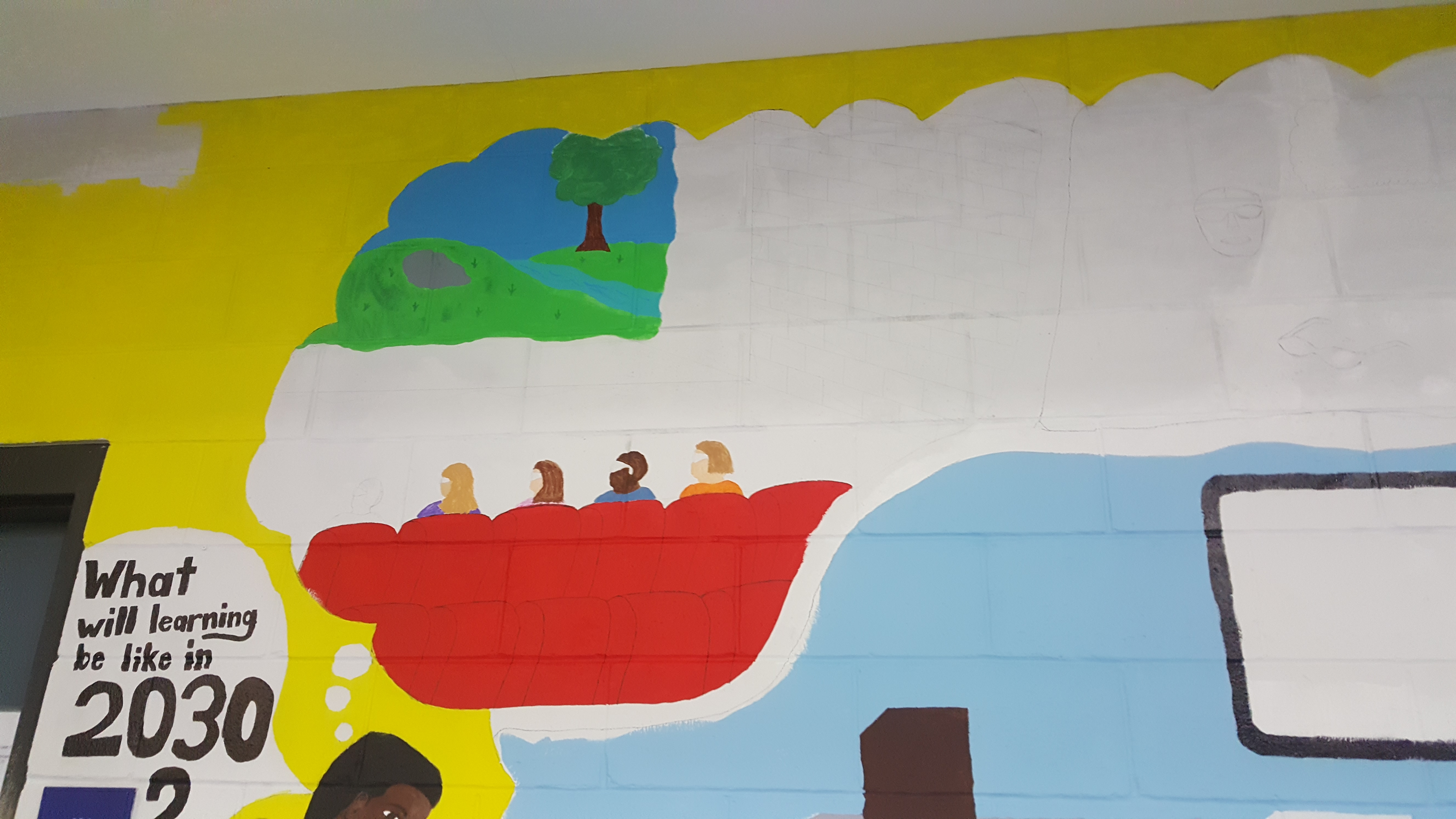 johnson brought together the English and Art Departments across the Hinds County School District to design an arts-integrated learning exchange in which 12th-grade students studied contemporary experiments in high school pedagogy, engaged in collaborative dialog on the future of learning, wrote critical essays on the subject, and then passed their visionary ideas to their visual artist peers to plan and execute a mural. The mural pictured above was painted by johnson in the school hallway the night before the project began.