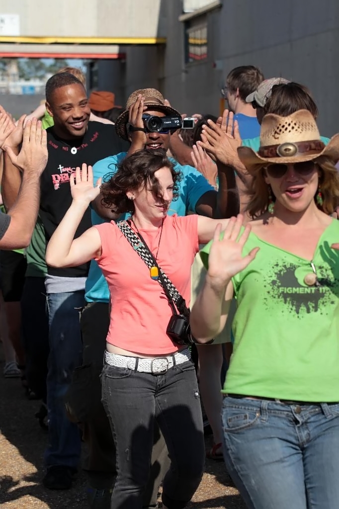 For the first FIGMENT interactive arts festival held in Jackson, MS, daniel created a 2-day theater game which would interact with the festival goers and projects. johnson invited eight Jacksonians of different ages, ethnicities, and backgrounds to come together as a “Council of Suggestion”. As the Council of Suggestion, they committed to be open, honest, and genuine with each other, focusing their energy on formulating useful suggestions for the furtherance of the FIGMENT Mission. To maintain their bond, they agreed to not interact with or touch any other person or object throughout the performance. To communicate their suggestions, they had to unanimously call it out three times - once affirmed in unison, Mr. Muddle, played by johnson, would be bound to compel other FIGMENT goers to realize the suggestion. Additionally, they were guided by an overall suggestion they had for FIGMENT - that everyone at FIGMENT have the opportunity to high five everyone at FIGMENT in a High Five Gauntlet.